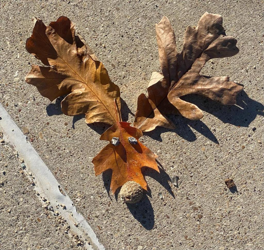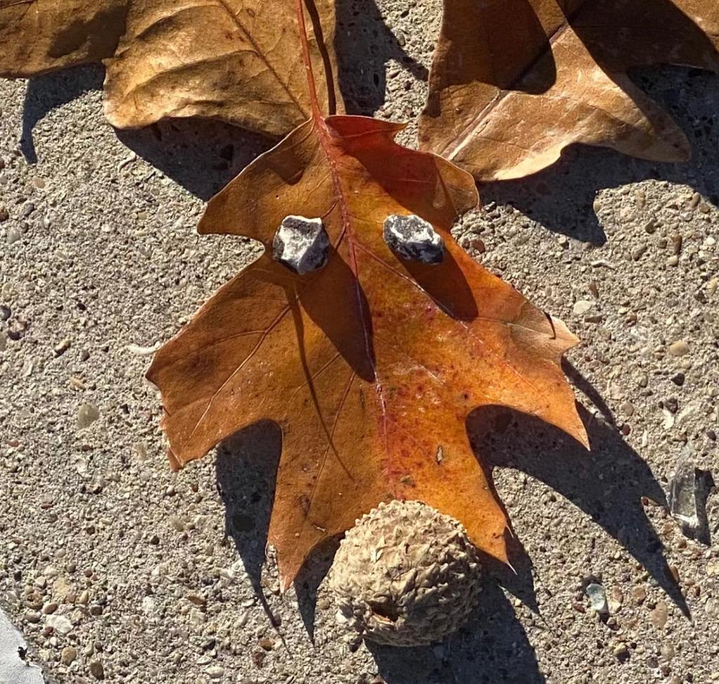 You make the charriter with leaves and you leave them to be seen. It could be the wind takes them away right away but it’s still fun and if you are quick, you can snap a photo.